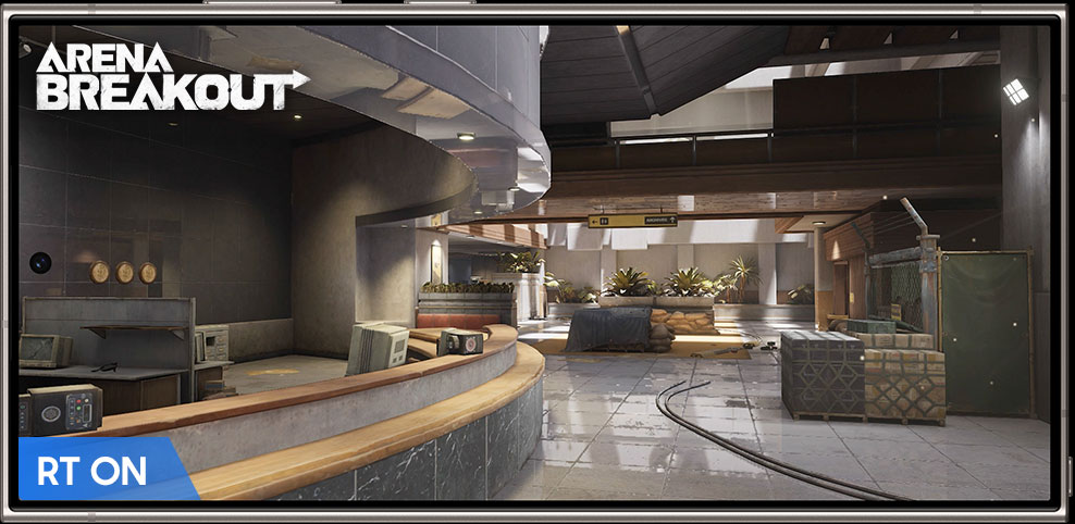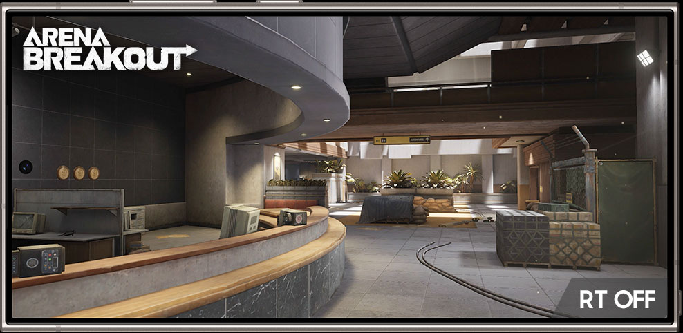 Arena Breakout logo. Ray tracing on. Ray tracing off. A before and after comparison on the display of Galaxy S24 Ultra depicts ray tracing effects in a gameplay snapshot from Arena Breakout. Ray tracing makes reflections on surfaces more pronounced.