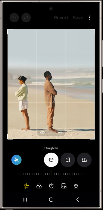 A photo is edited in the Gallery app. An edit button is tapped and one of the subjects is selected. They are moved to another location in the picture. Then, missing areas are filled in.