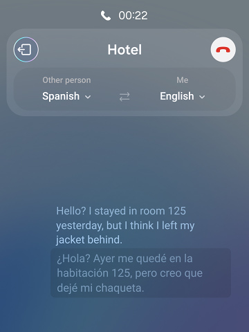 A phone call is translated in real time. The dialogue is shown on screen as a text conversation in two languages.