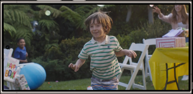 A video of a water balloon fight at a child’s backyard birthday party plays at normal speed on the display of Galaxy S24 Ultra. A grown-up emerges from behind the gift table. As a water balloon explodes on his head, the video drops into slow motion.